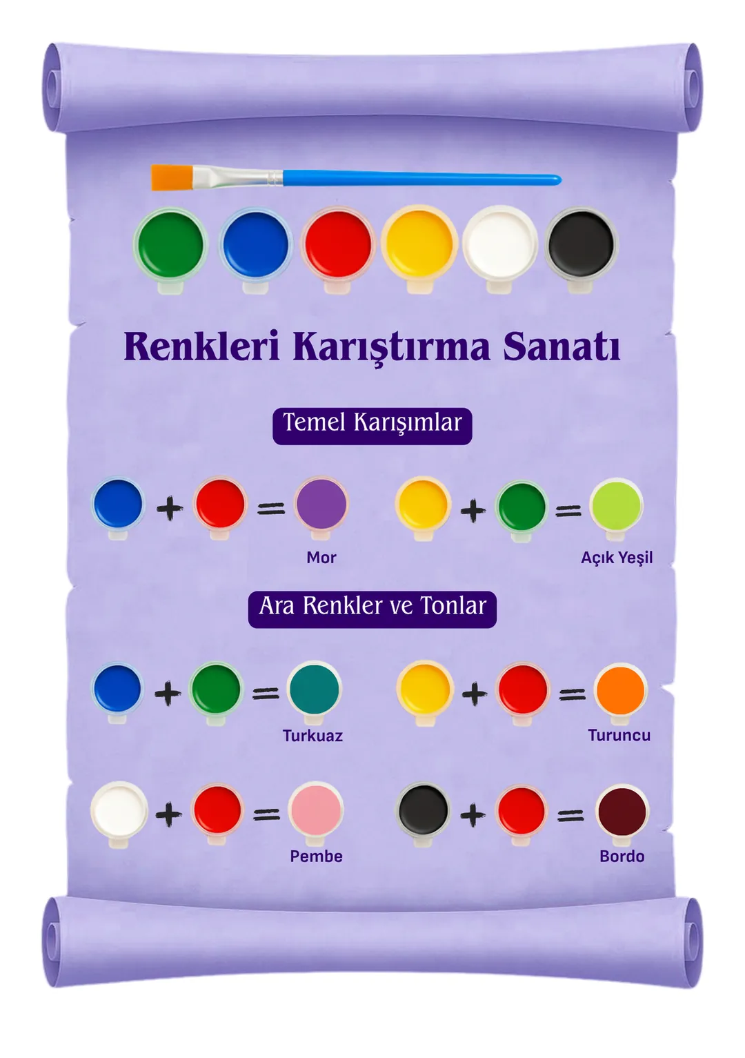 | Mavi + Yeşil = Turkuaz | Deniz, gökyüzü ve tropik tonlar için canlı bir karışım. |