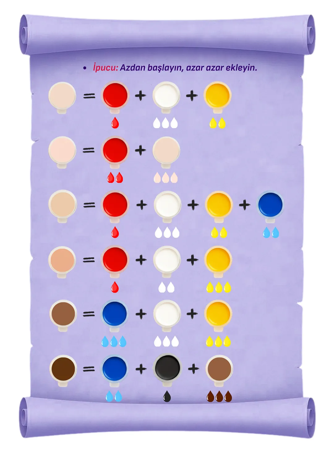 İpucu: Her karışımı küçük bir alanda dene; kuruyunca renk tonu biraz koyulaşabilir!